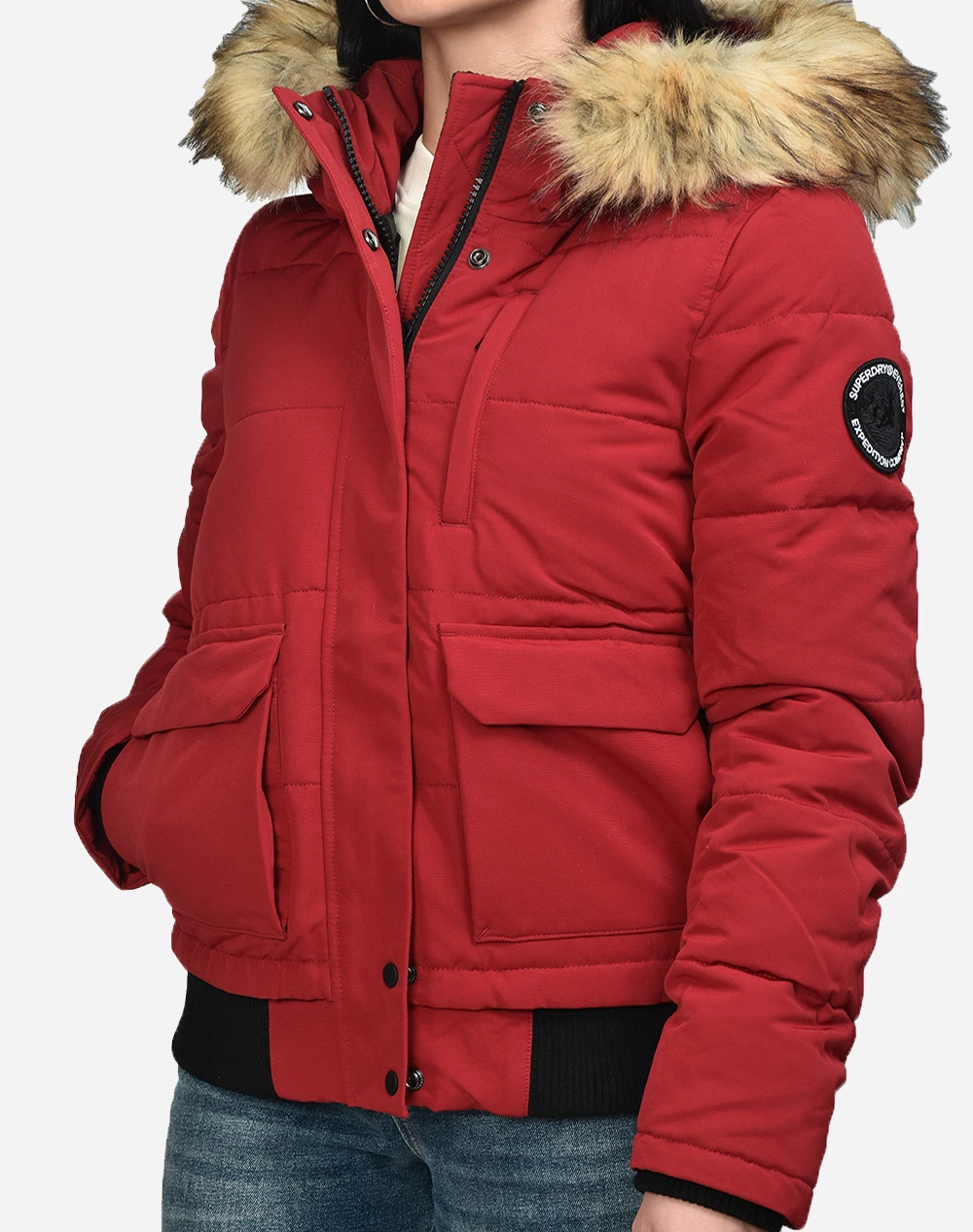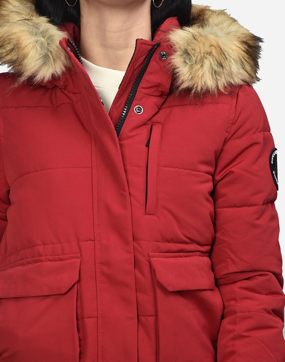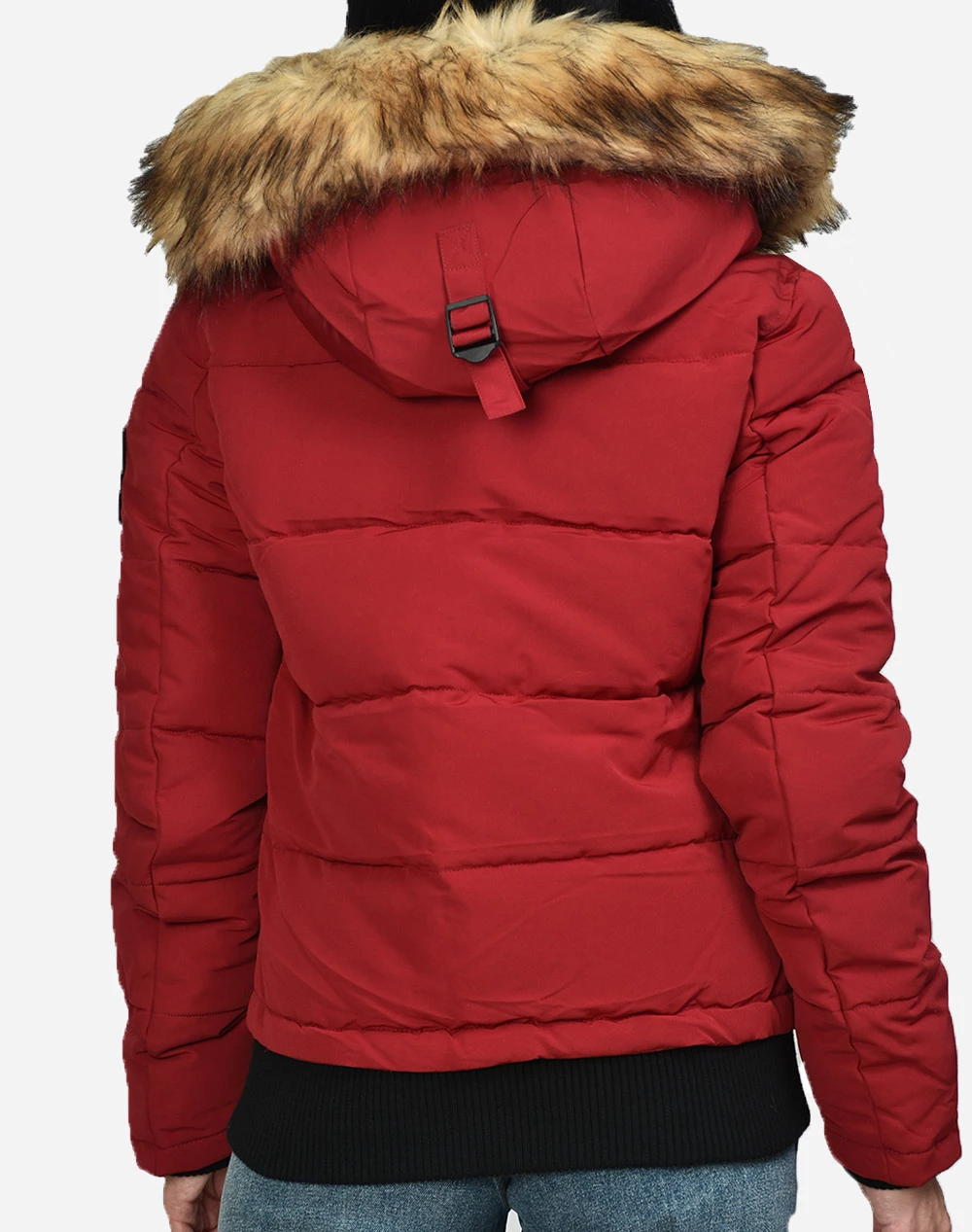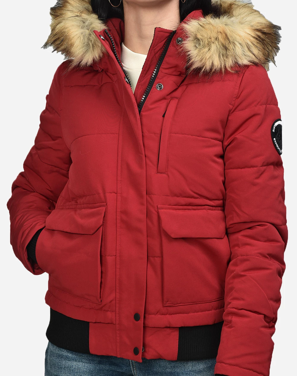 Μπουφάν γυναικείο με κουκούλα σε στυλ Bomber και σε στενή εφαρμογή. Με λεπτομέρεια συνθετική γούνα στη κουκούλα. Κλείνει με φερμουάρ και κουμπιά. (Σύνθεση: 100% Πολυεστέρας)