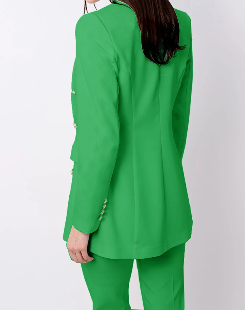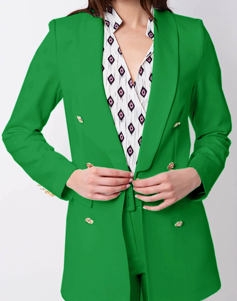 Σακάκι μακρύ με γιακά, μονόχρωμο και σε κανονική γραμμή. Διαθέτει διακοσμητικά κουμπιά μπροστά και στα μανίκια, βάτες στους ώμους και μπροστινές τσέπες με κάπακι. Κλείνει με κόπιτσα μπροατά (Σύνθεση: 88|% Πολύεστέρας 12% Σπάντεξ)
