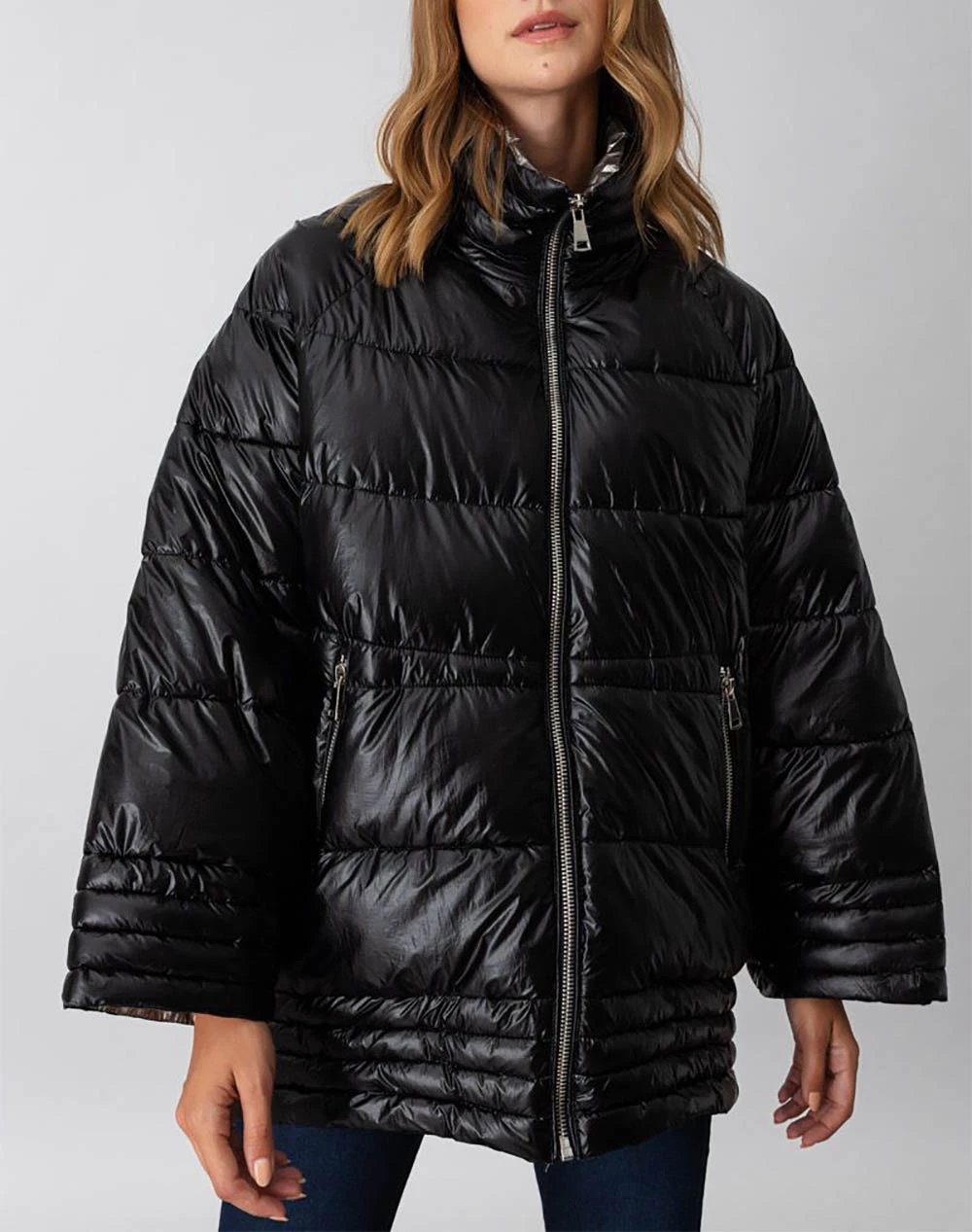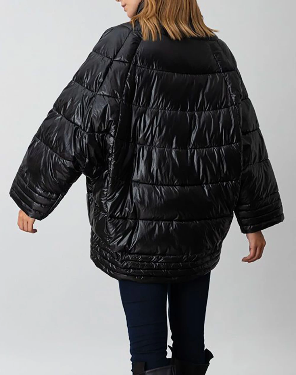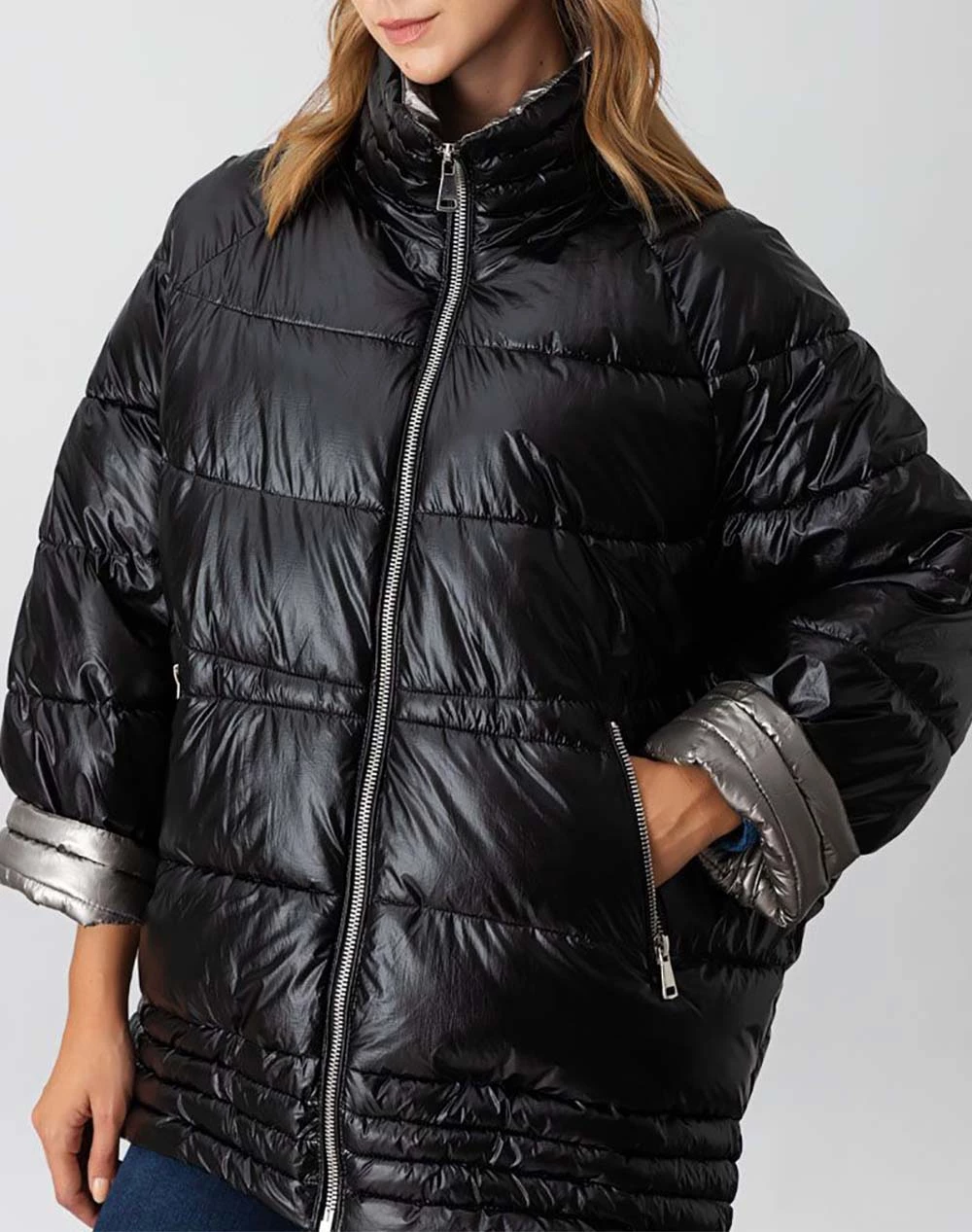 Μπουφάν σε στυλ Oversized, μονόχρωμο με μεταλιζέ απόχρωση και τύπου Puffer. Διαθέτει μακριά μανίκια νυχτερίδα και κλείνει με φερμουάρ μπροστά. (Σύνθεση: 100% Πολυεστέρας)
