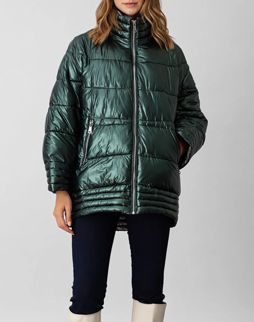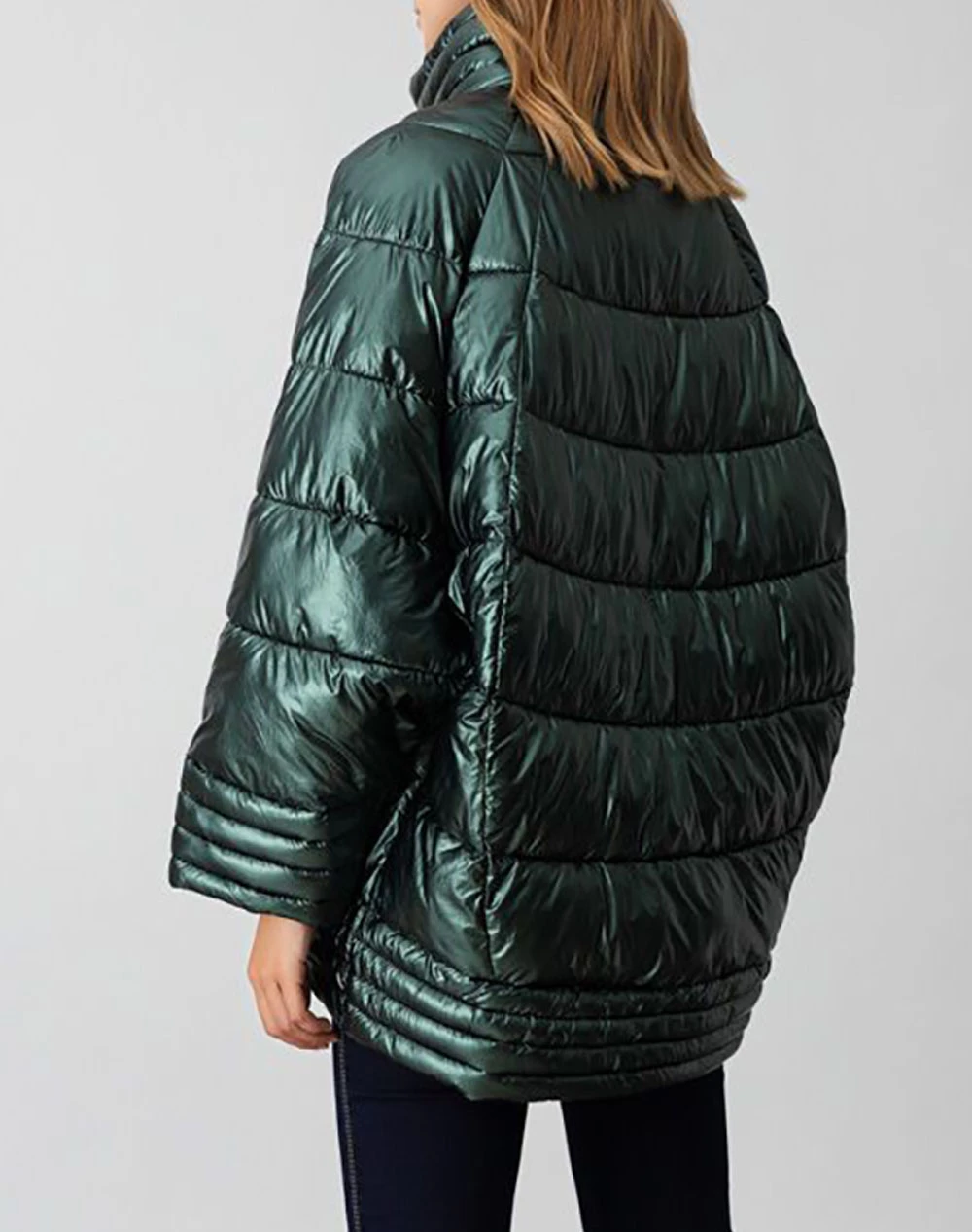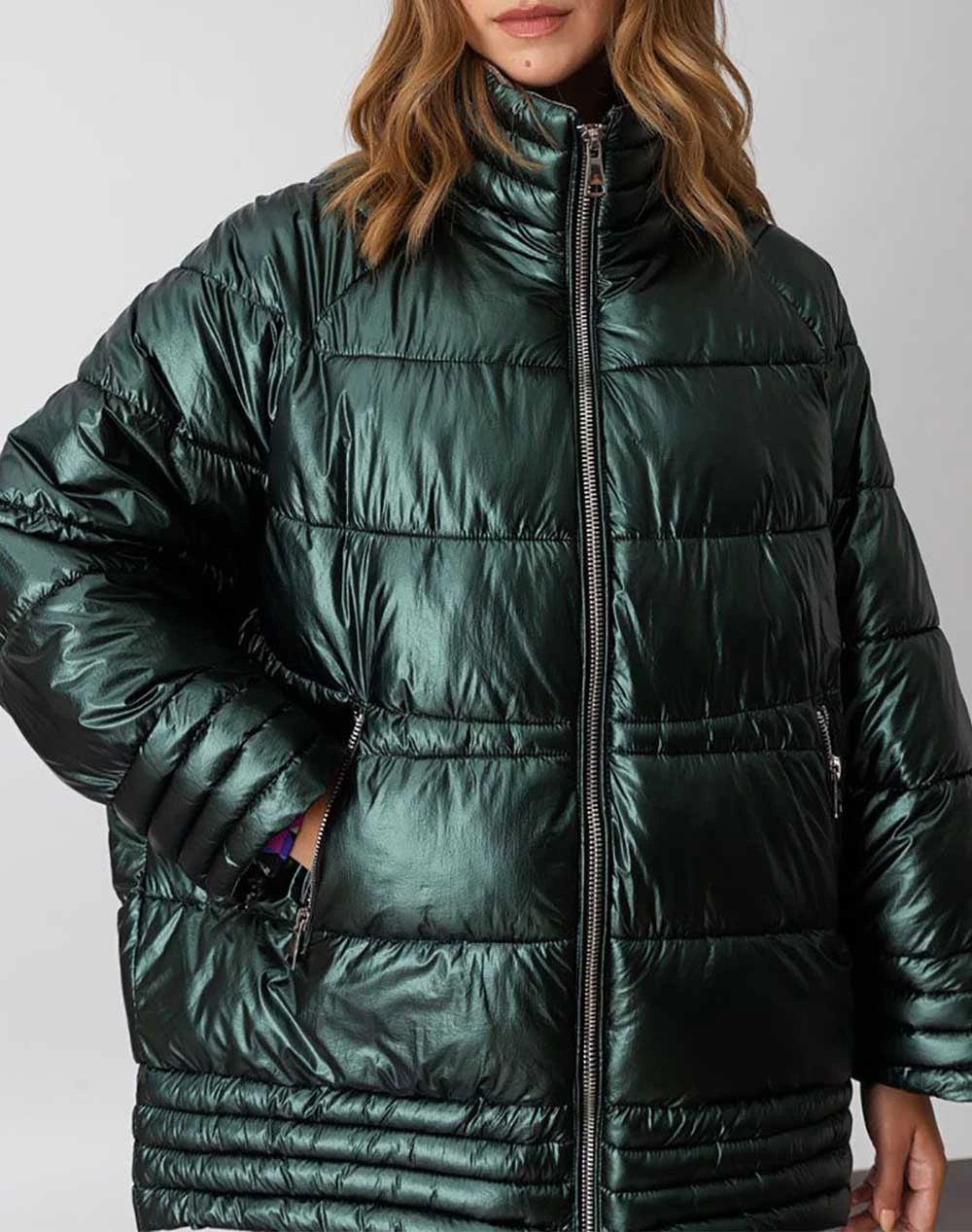 Μπουφάν σε στυλ Oversized, μονόχρωμο με μεταλιζέ απόχρωση και τύπου Puffer. Διαθέτει μακριά μανίκια νυχτερίδα και κλείνει με φερμουάρ μπροστά. (Σύνθεση: 100% Πολυεστέρας)